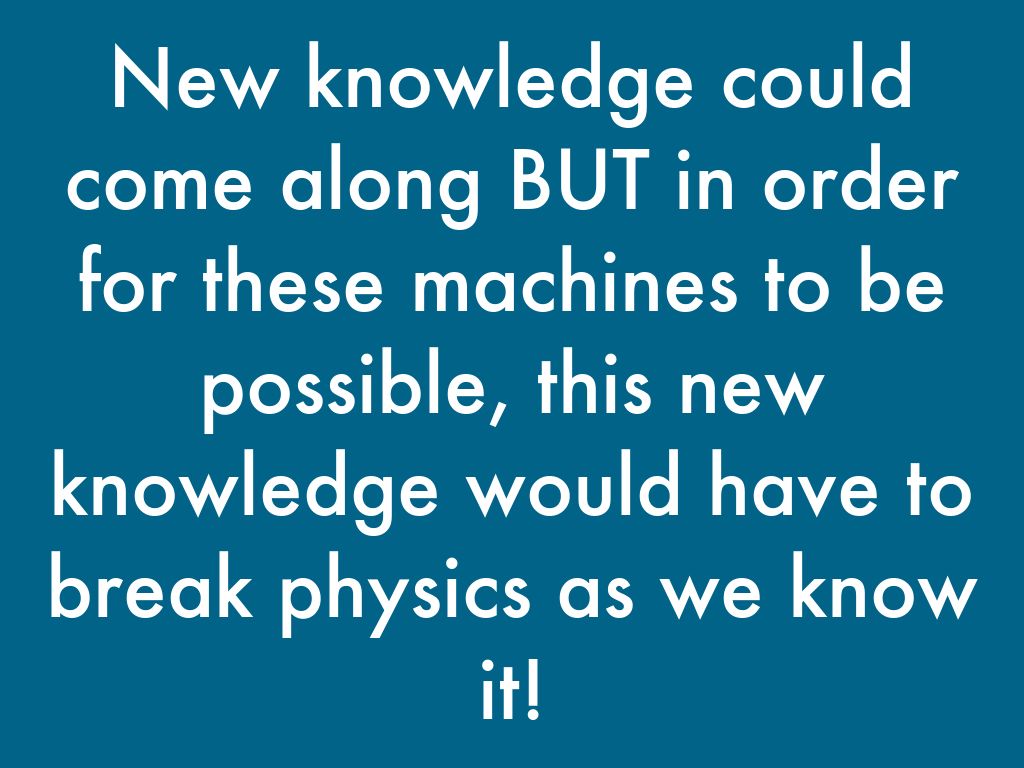 New knowledge could come along BUT in order for these machines to be possible, this new knowledge would have to break physics as we know it!