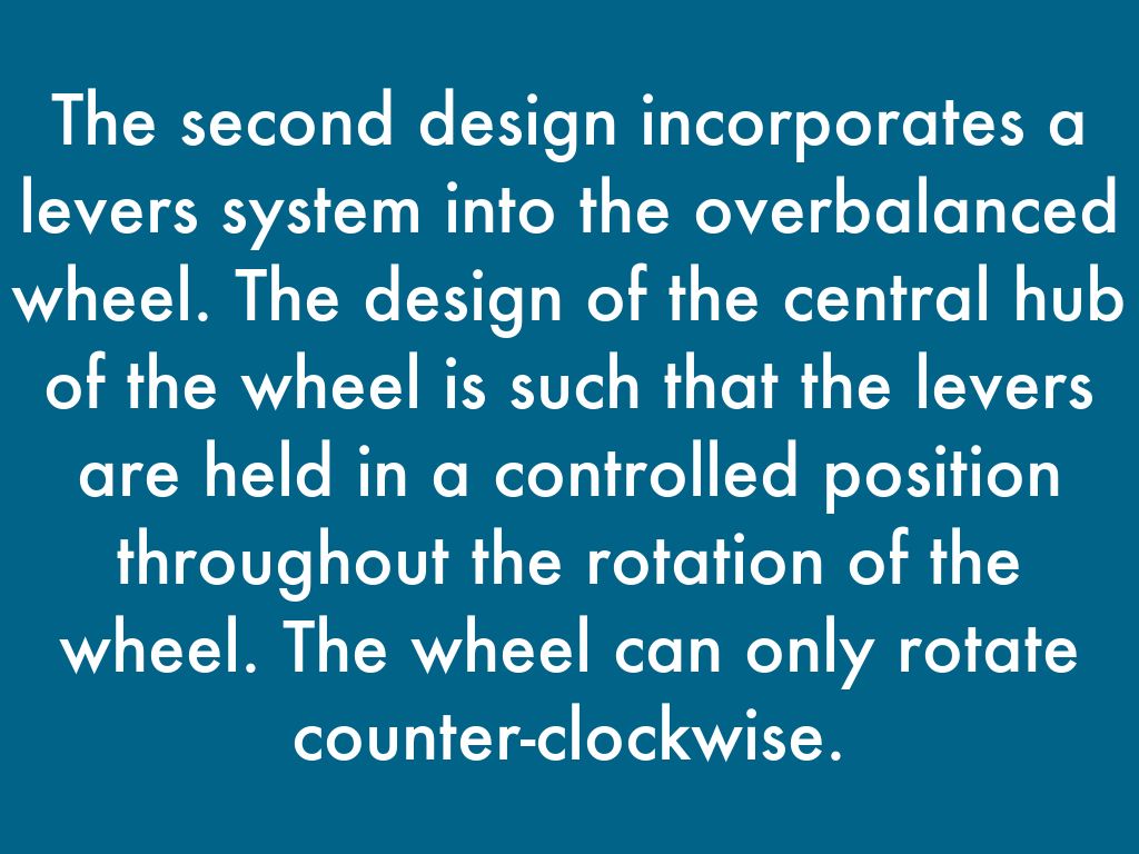 The second design incorporates a levers system into the overbalanced wheel. The design of the central hub of the wheel is such that the levers are held in a controlled position throughout the rotation of the wheel. The wheel can only rotate counter-clockwise.
