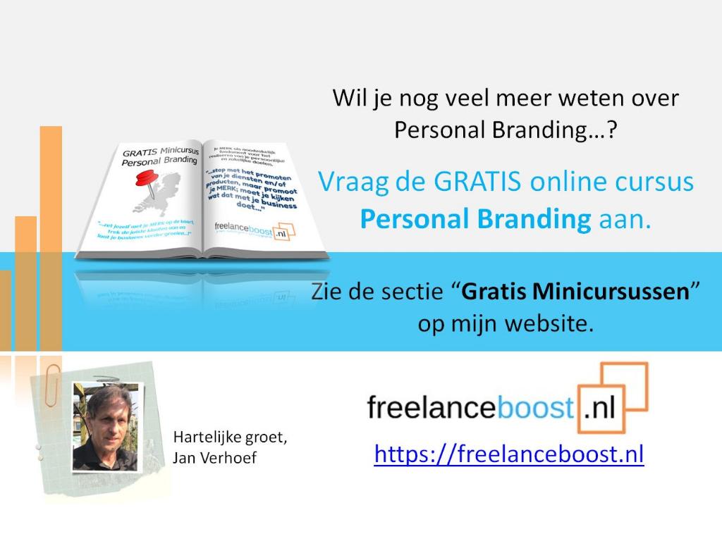 Vraag de gratis online cursus Personal Branding aan. Zie de sectie "Gratis Minicursussen" op mijn website https://freelanceboost.nl.
