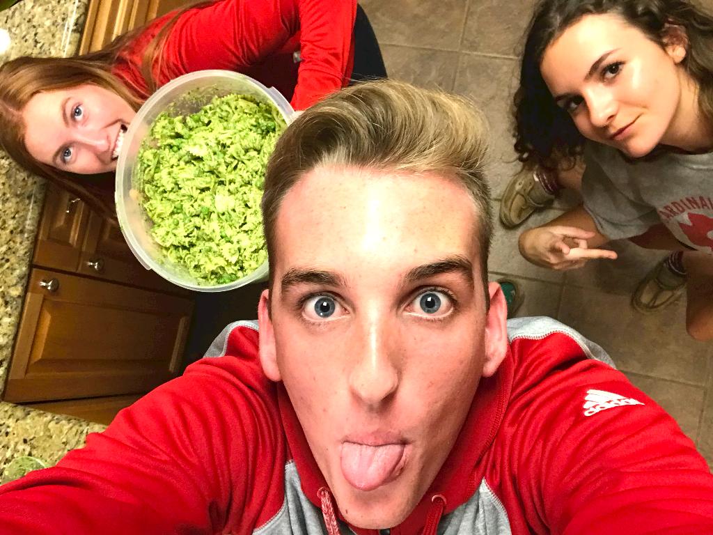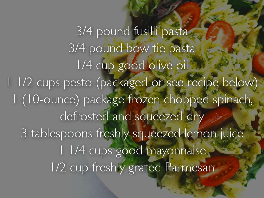 3/4 pound fusilli pasta 3/4 pound bow tie pasta 1/4 cup good olive oil 1 1/2 cups pesto (packaged or see recipe below) 1 (10-ounce) package frozen chopped spinach, defrosted and squeezed dry 3 tablespoons freshly squeezed lemon juice 1 1/4 cups good mayonnaise 1/2 cup freshly grated Parmesan