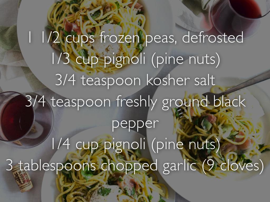 In the bowl of a food processor fitted with a steel blade, puree the pesto, spinach, and lemon juice. Add the mayonnaise and puree. Add the pesto mixture to the cooled pasta and then add the Parmesan, peas, pignoli, salt, and pepper. Mix well, season to taste, and serve at room temperature.