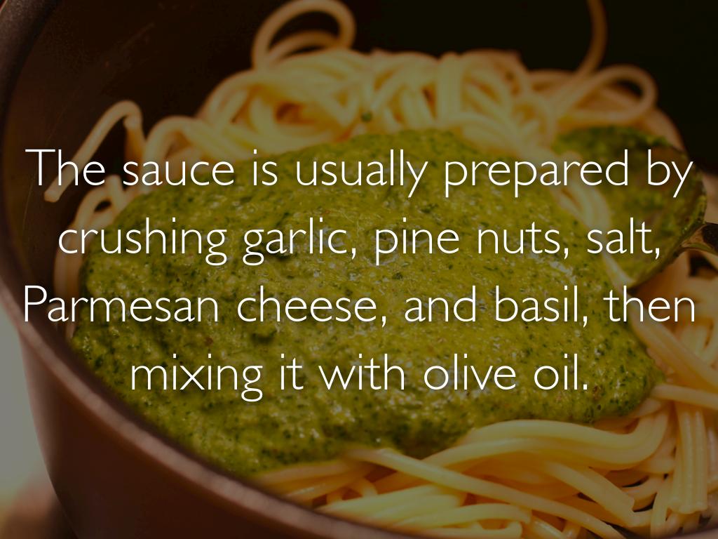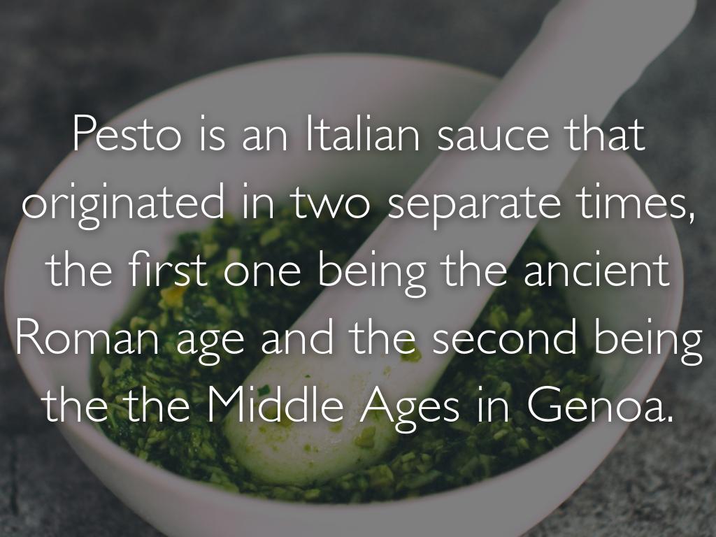 Pesto is an Italian sauce that originated in two separate times, the first one being the ancient Roman age and the second being the the Middle Ages in Genoa.