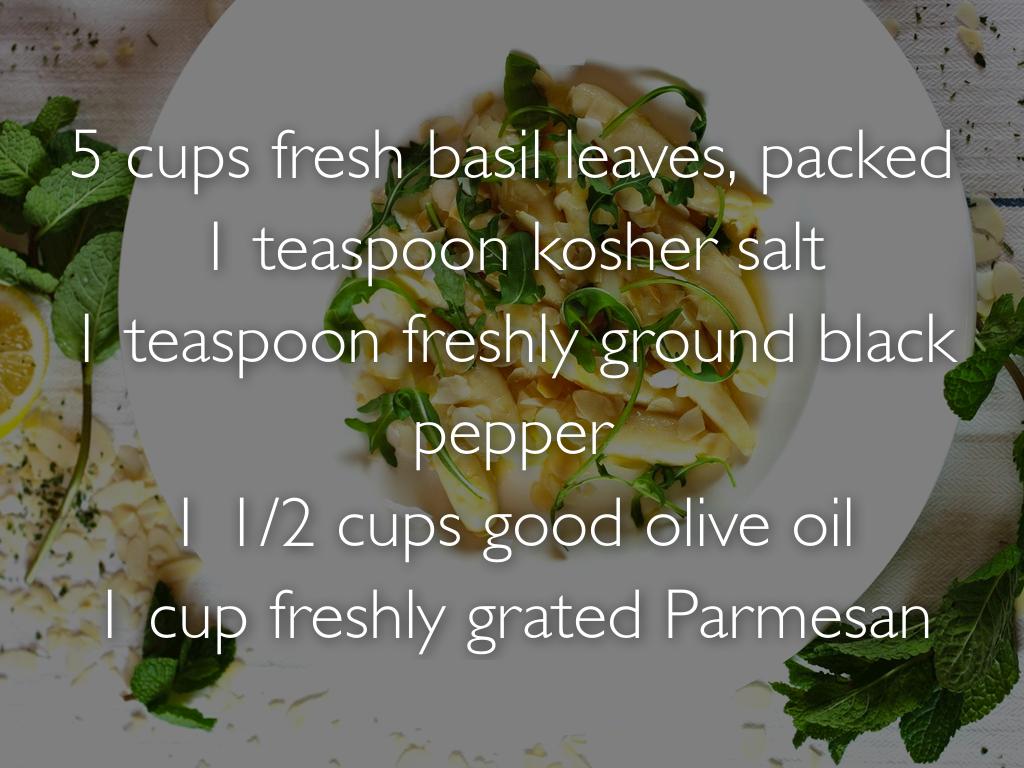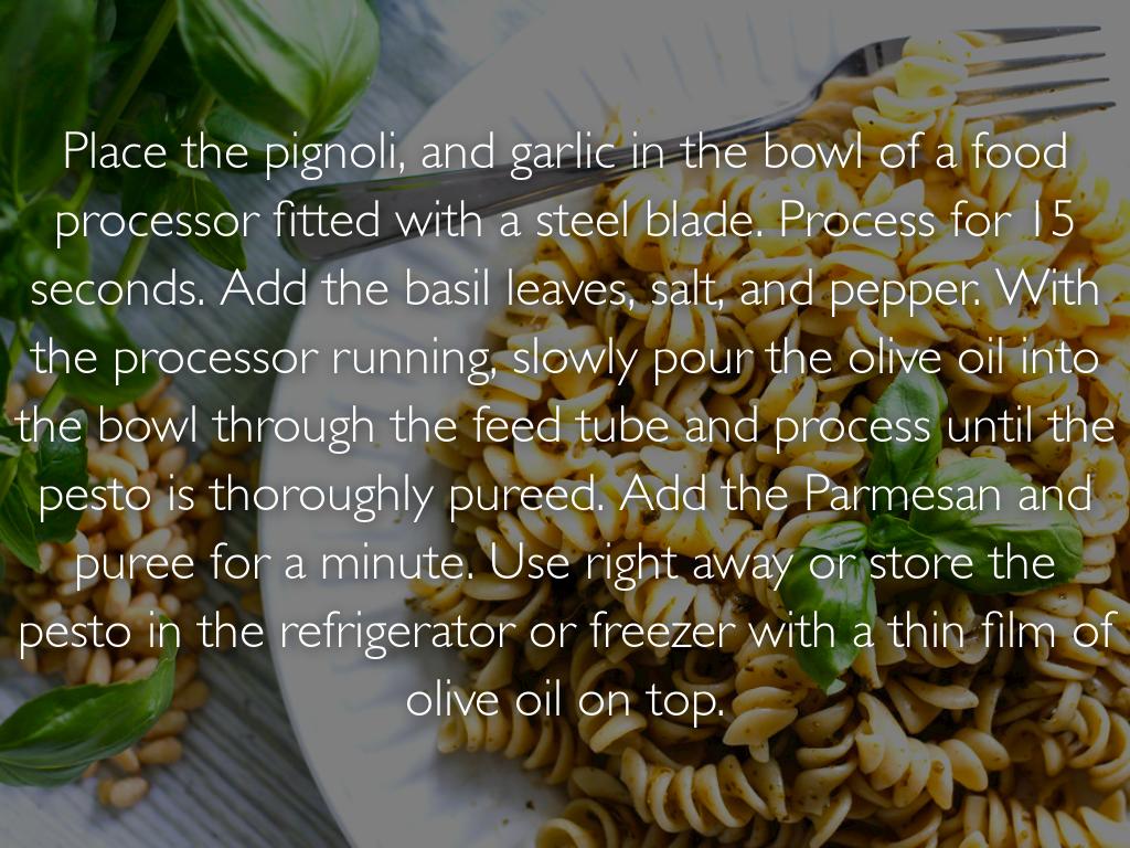 Place the pignoli, and garlic in the bowl of a food processor fitted with a steel blade. Process for 15 seconds. Add the basil leaves, salt, and pepper. With the processor running, slowly pour the olive oil into the bowl through the feed tube and process until the pesto is thoroughly pureed. Add the Parmesan and puree for a minute. Use right away or store the pesto in the refrigerator or freezer with a thin film of olive oil on top.