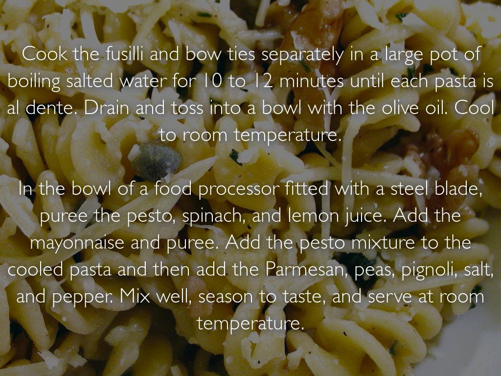 Cook the fusilli and bow ties separately in a large pot of boiling salted water for 10 to 12 minutes until each pasta is al dente. Drain and toss into a bowl with the olive oil. Cool to room temperature.