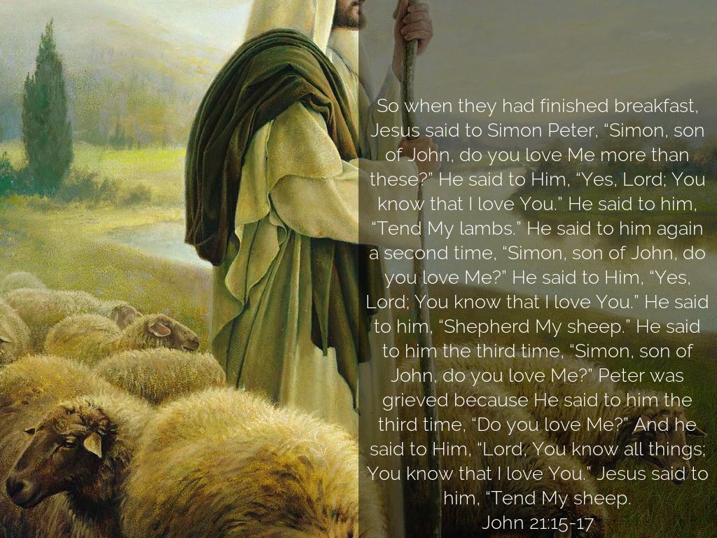So when they had finished breakfast, Jesus said to Simon Peter, “Simon, son of John, do you love Me more than these?” He said to Him, “Yes, Lord; You know that I love You.” He said to him, “Tend My lambs.” He said to him again a second time, “Simon, son of John, do you love Me?” He said to Him, “Yes, Lord; You know that I love You.” He said to him, “Shepherd My sheep.” He said to him the third time, “Simon, son of John, do you love Me?” Peter was grieved because He said to him the third time, “Do you love Me?” And he said to Him, “Lord, You know all things; You know that I love You.” Jesus said to him, “Tend My sheep. John 21:15-17
