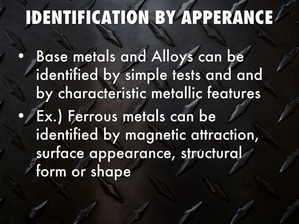Base metals and Alloys can be identified by simple tests and and by characteristic metallic features