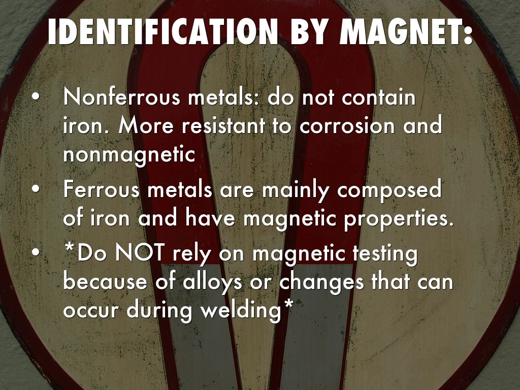 Ex.) Ferrous metals can be identified by magnetic attraction, surface appearance, structural form or shape