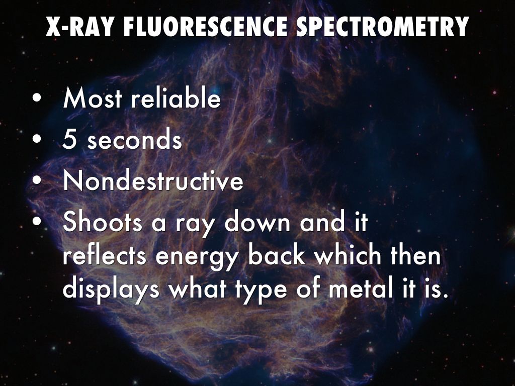 Shoots a ray down and it reflects energy back which then displays what type of metal it is.