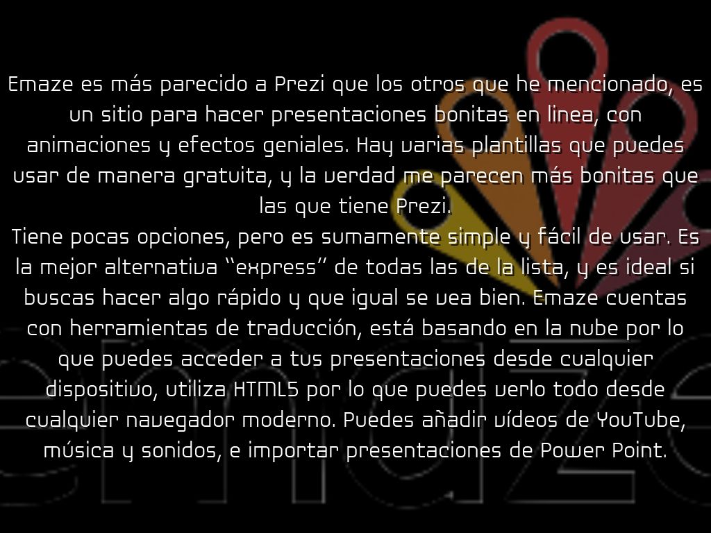 Tiene pocas opciones, pero es sumamente simple y fácil de usar. Es la mejor alternativa “express” de todas las de la lista, y es ideal si buscas hacer algo rápido y que igual se vea bien. Emaze cuentas con herramientas de traducción, está basando en la nube por lo que puedes acceder a tus presentaciones desde cualquier dispositivo, utiliza HTML5 por lo que puedes verlo todo desde cualquier navegador moderno. Puedes añadir vídeos de YouTube, música y sonidos, e importar presentaciones de Power Point.