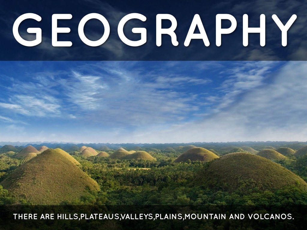 THERE ARE HILLS,PLATEAUS,VALLEYS,PLAINS,MOUNTAIN AND VOLCANOS.