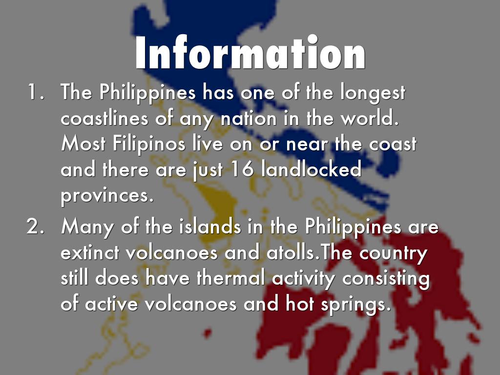 The Philippines has one of the longest coastlines of any nation in the world. Most Filipinos live on or near the coast and there are just 16 landlocked provinces.