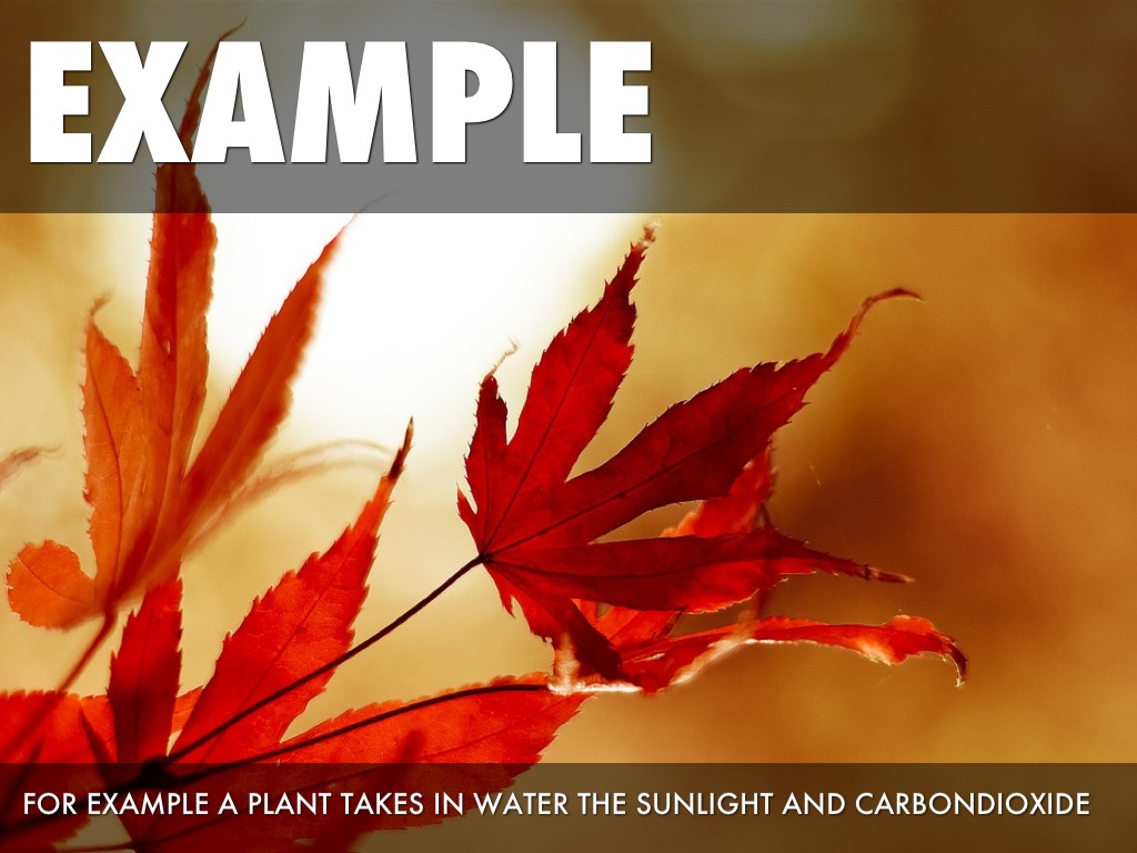 FOR EXAMPLE A PLANT TAKES IN WATER THE SUNLIGHT AND CARBONDIOXIDE