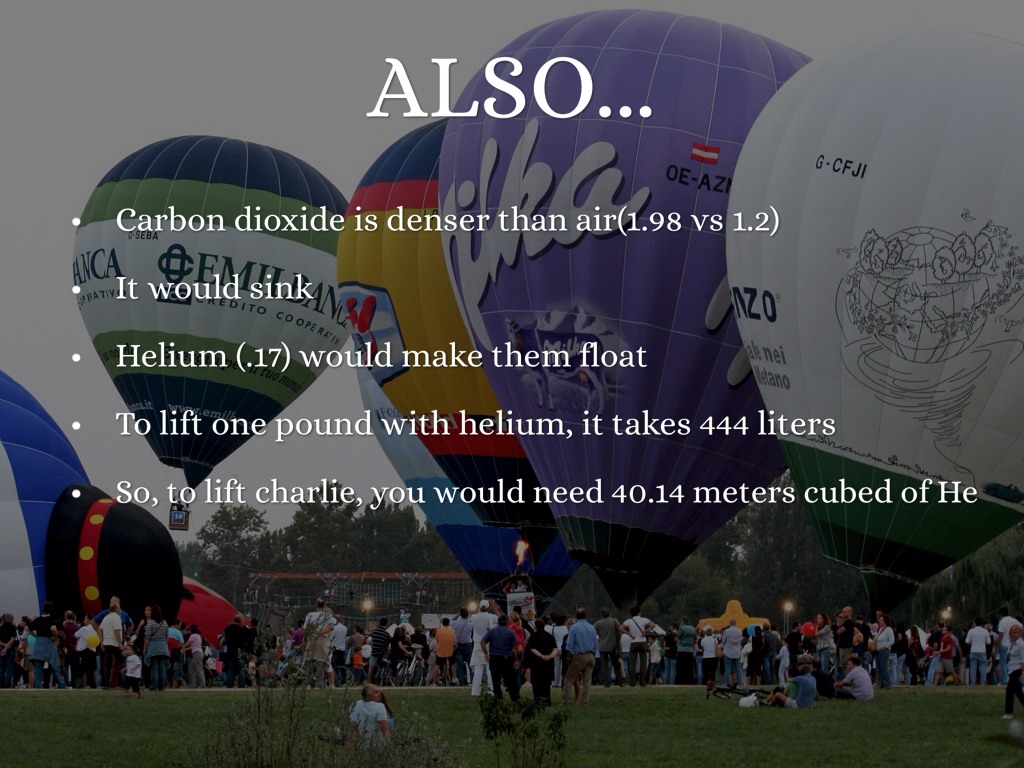 So, to lift charlie, you would need 40.14 meters cubed of He