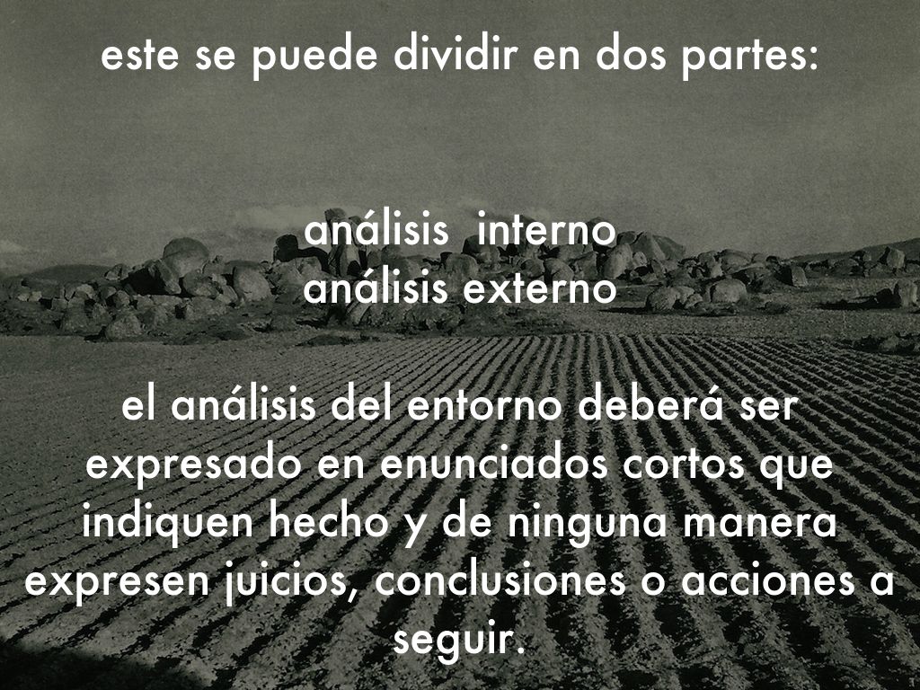 el análisis del entorno deberá ser expresado en enunciados cortos que indiquen hecho y de ninguna manera expresen juicios, conclusiones o acciones a seguir.