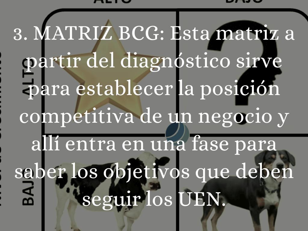 3. MATRIZ BCG: Esta matriz a partir del diagnóstico sirve para establecer la posición competitiva de un negocio y allí entra en una fase para saber los objetivos que deben seguir los UEN.