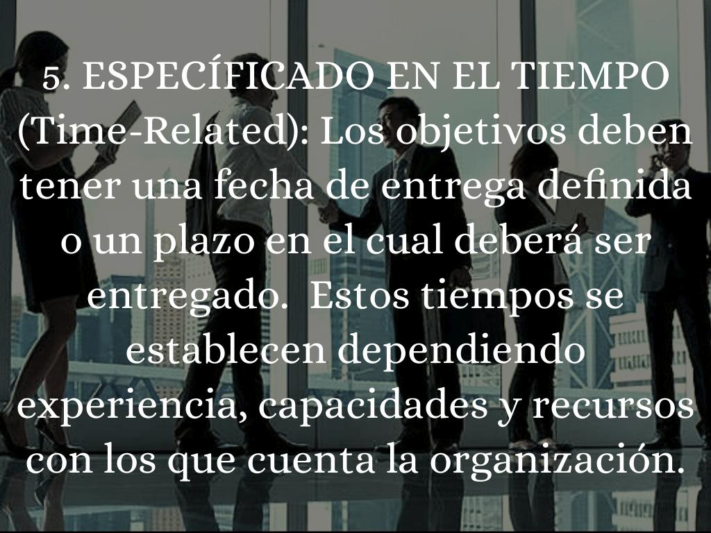 5. ESPECÍFICADO EN EL TIEMPO (Time-Related): Los objetivos deben tener una fecha de entrega definida o un plazo en el cual deberá ser entregado. Estos tiempos se establecen dependiendo experiencia, capacidades y recursos con los que cuenta la organización.