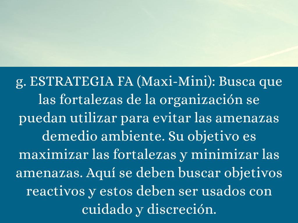 g. ESTRATEGIA FA (Maxi-Mini): Busca que las fortalezas de la organización se puedan utilizar para evitar las amenazas demedio ambiente. Su objetivo es maximizar las fortalezas y minimizar las amenazas. Aquí se deben buscar objetivos reactivos y estos deben ser usados con cuidado y discreción.