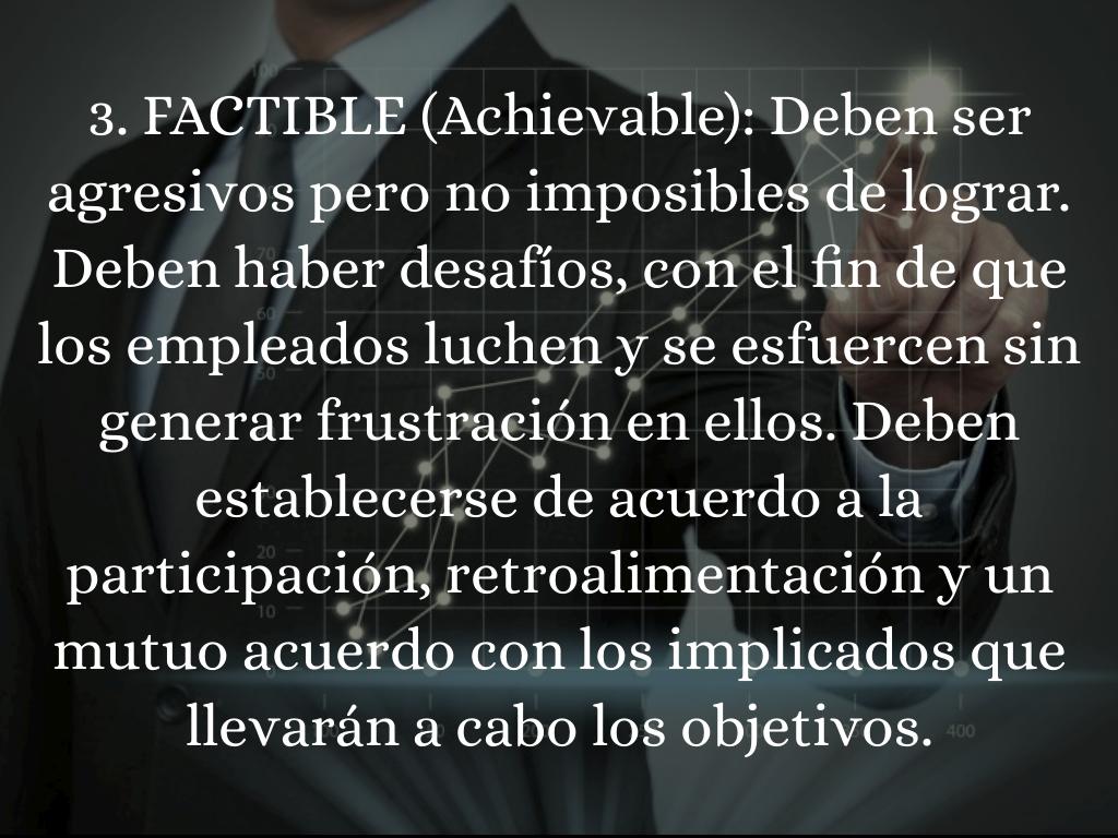 3. FACTIBLE (Achievable): Deben ser agresivos pero no imposibles de lograr. Deben haber desafíos, con el fin de que los empleados luchen y se esfuercen sin generar frustración en ellos. Deben establecerse de acuerdo a la participación, retroalimentación y un mutuo acuerdo con los implicados que llevarán a cabo los objetivos.