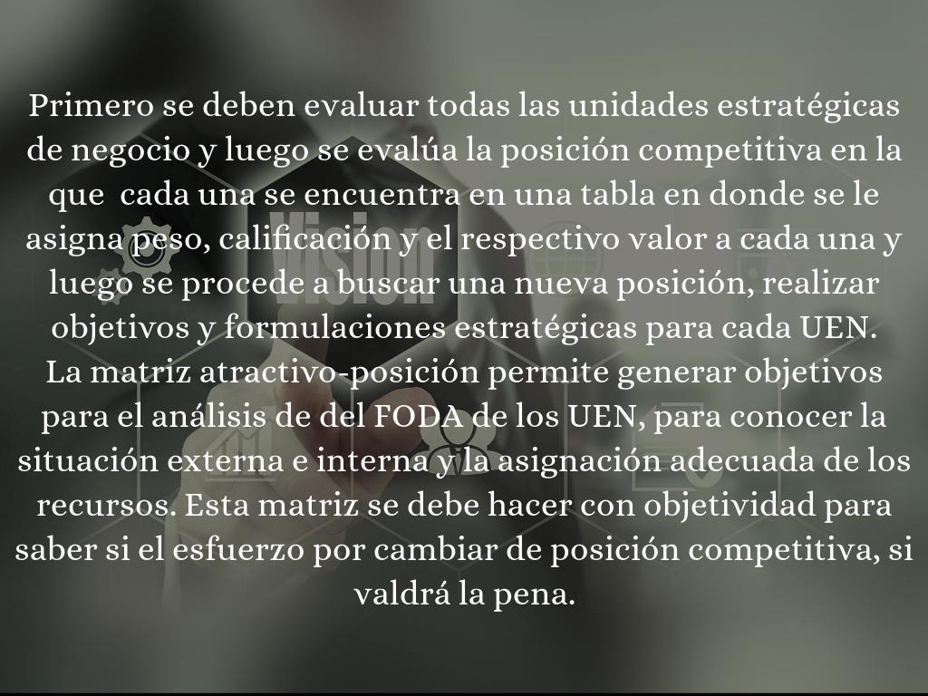 Primero se deben evaluar todas las unidades estratégicas de negocio y luego se evalúa la posición competitiva en la que cada una se encuentra en una tabla en donde se le asigna peso, calificación y el respectivo valor a cada una y luego se procede a buscar una nueva posición, realizar objetivos y formulaciones estratégicas para cada UEN.