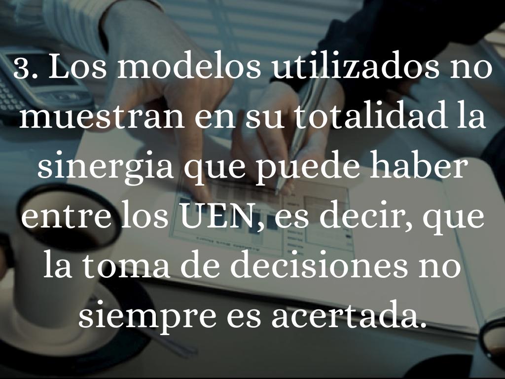 3. Los modelos utilizados no muestran en su totalidad la sinergia que puede haber entre los UEN, es decir, que la toma de decisiones no siempre es acertada.