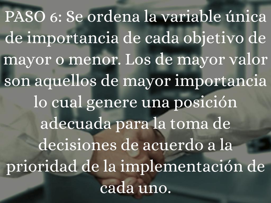 PASO 6: Se ordena la variable única de importancia de cada objetivo de mayor o menor. Los de mayor valor son aquellos de mayor importancia lo cual genere una posición adecuada para la toma de decisiones de acuerdo a la prioridad de la implementación de cada uno.