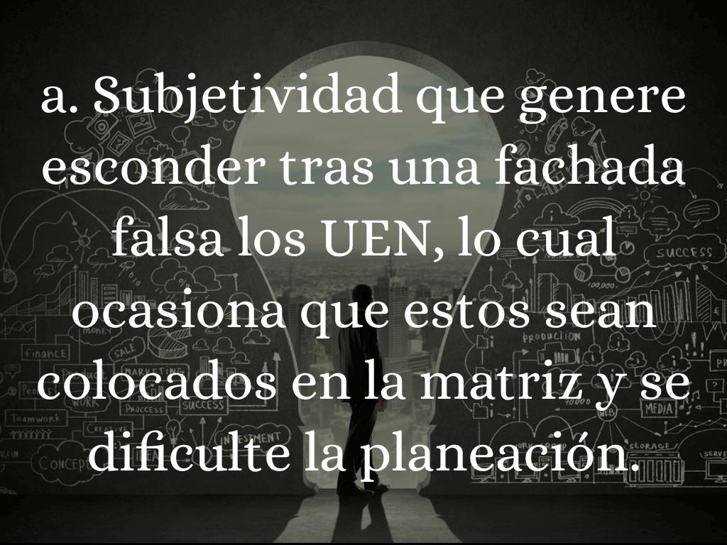 a. Subjetividad que genere esconder tras una fachada falsa los UEN, lo cual ocasiona que estos sean colocados en la matriz y se dificulte la planeación.