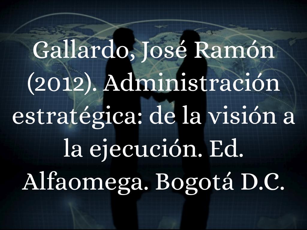 Gallardo, José Ramón (2012). Administración estratégica: de la visión a la ejecución. Ed. Alfaomega. Bogotá D.C.