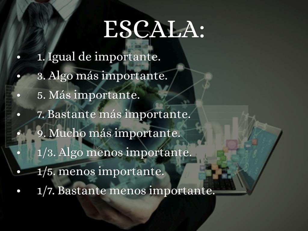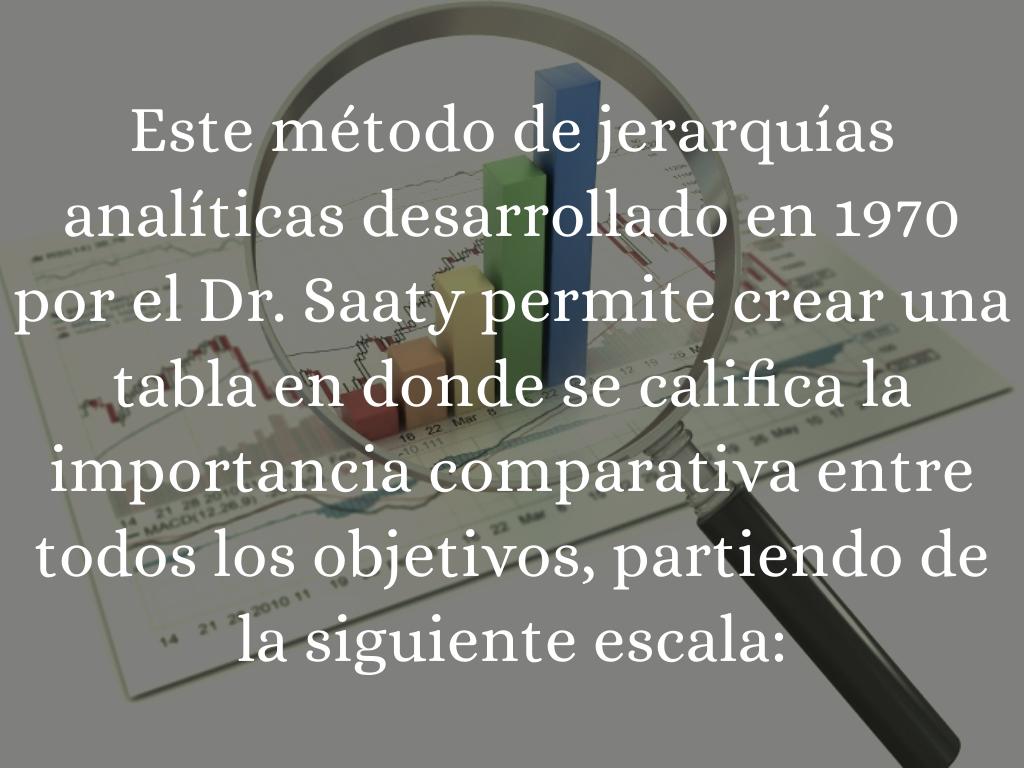 Este método de jerarquías analíticas desarrollado en 1970 por el Dr. Saaty permite crear una tabla en donde se califica la importancia comparativa entre todos los objetivos, partiendo de la siguiente escala: