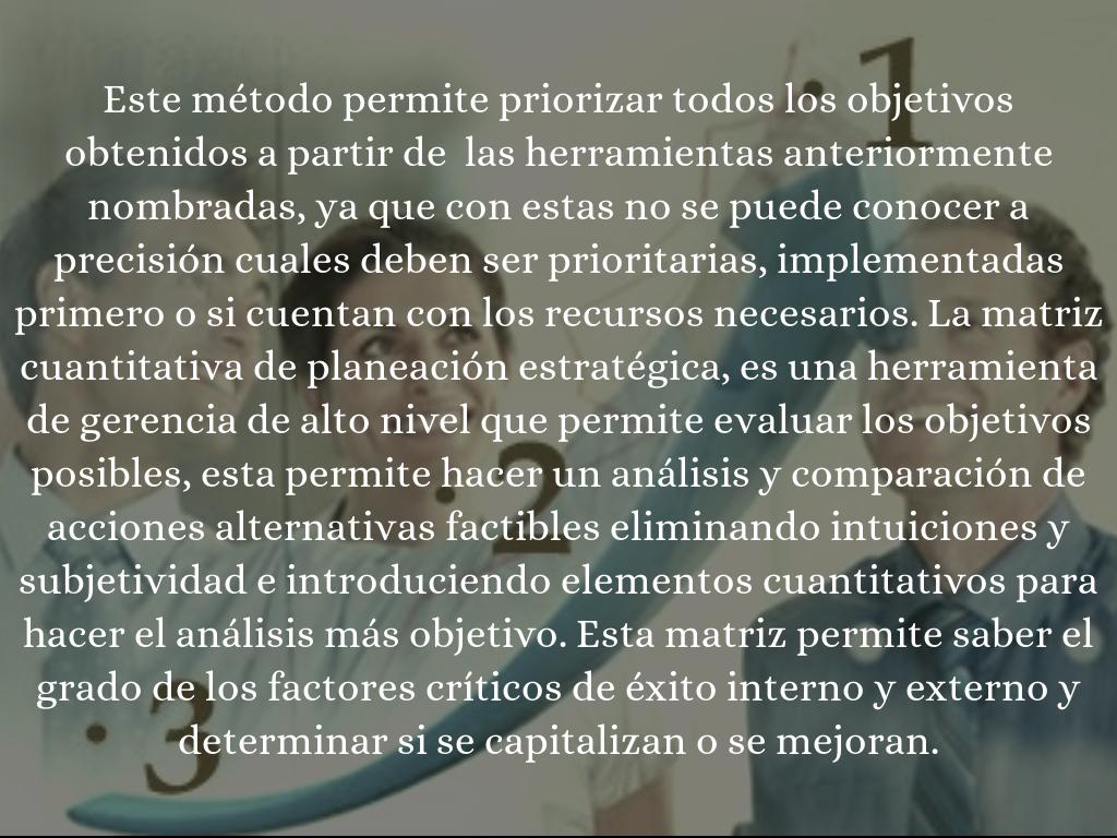 Este método permite priorizar todos los objetivos obtenidos a partir de las herramientas anteriormente nombradas, ya que con estas no se puede conocer a precisión cuales deben ser prioritarias, implementadas primero o si cuentan con los recursos necesarios. La matriz cuantitativa de planeación estratégica, es una herramienta de gerencia de alto nivel que permite evaluar los objetivos posibles, esta permite hacer un análisis y comparación de acciones alternativas factibles eliminando intuiciones y subjetividad e introduciendo elementos cuantitativos para hacer el análisis más objetivo. Esta matriz permite saber el grado de los factores críticos de éxito interno y externo y determinar si se capitalizan o se mejoran.