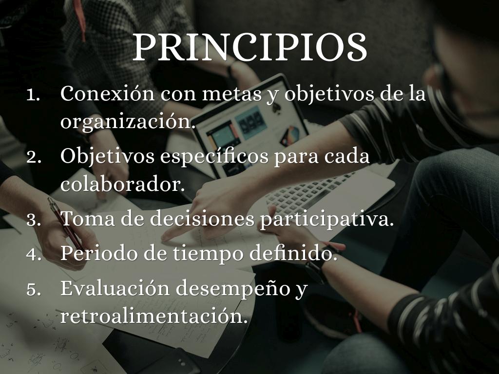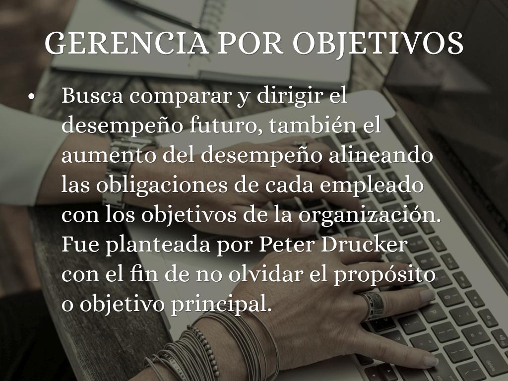 - Busca comparar y dirigir el desempeño futuro, también el aumento del desempeño alineando las obligaciones de cada empleado con los objetivos de la organización. Fue planteada por Peter Drucker con el fin de no olvidar el propósito o objetivo principal.