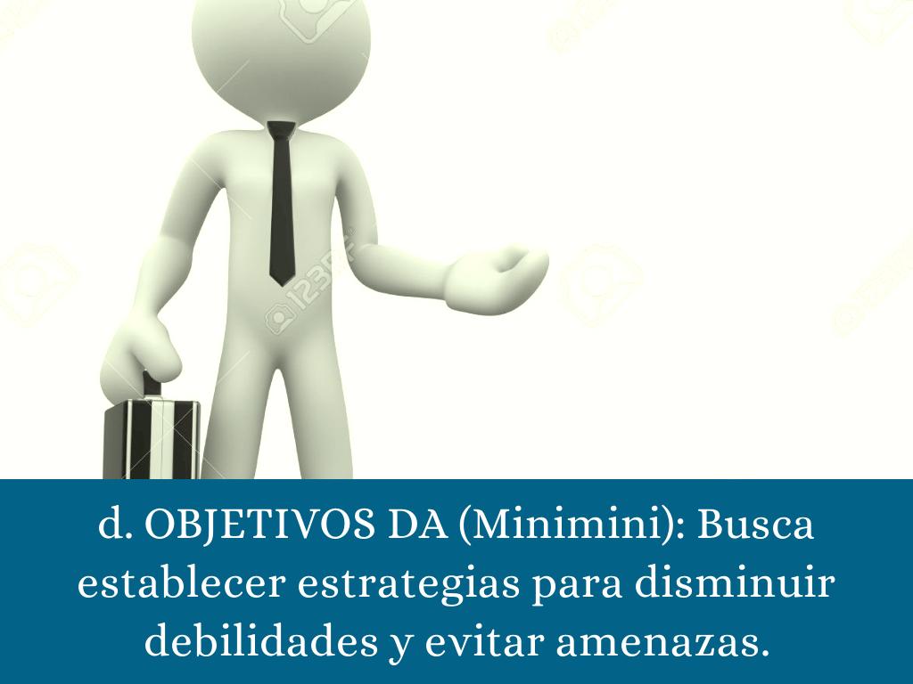d. OBJETIVOS DA (Minimini): Busca establecer estrategias para disminuir debilidades y evitar amenazas.