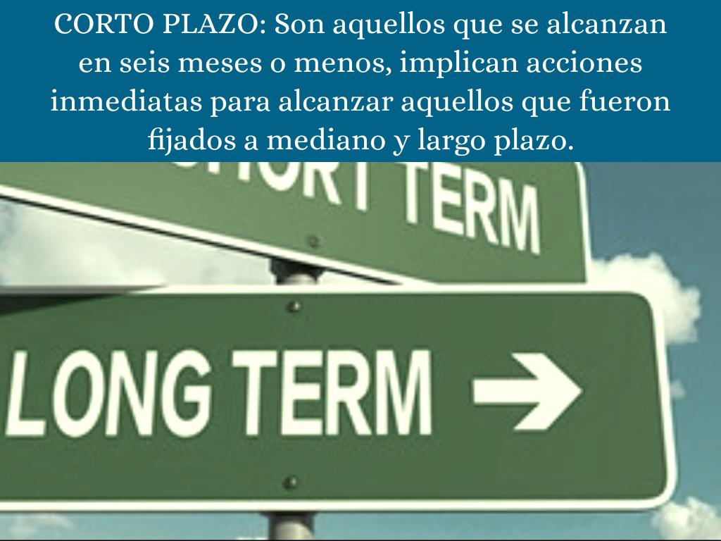 CORTO PLAZO: Son aquellos que se alcanzan en seis meses o menos, implican acciones inmediatas para alcanzar aquellos que fueron fijados a mediano y largo plazo.