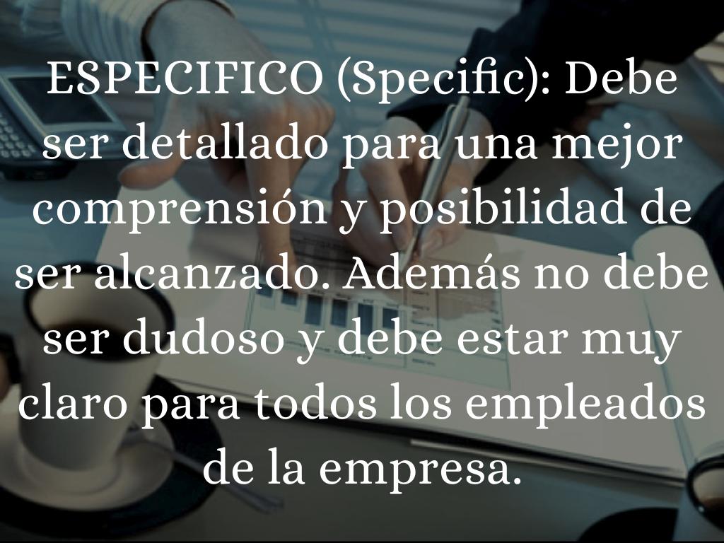 ESPECIFICO (Specific): Debe ser detallado para una mejor comprensión y posibilidad de ser alcanzado. Además no debe ser dudoso y debe estar muy claro para todos los empleados de la empresa.