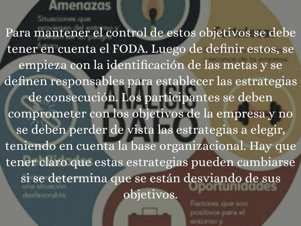 Para mantener el control de estos objetivos se debe tener en cuenta el FODA. Luego de definir estos, se empieza con la identificación de las metas y se definen responsables para establecer las estrategias de consecución. Los participantes se deben comprometer con los objetivos de la empresa y no se deben perder de vista las estrategias a elegir, teniendo en cuenta la base organizacional. Hay que tener claro que estas estrategias pueden cambiarse si se determina que se están desviando de sus objetivos.