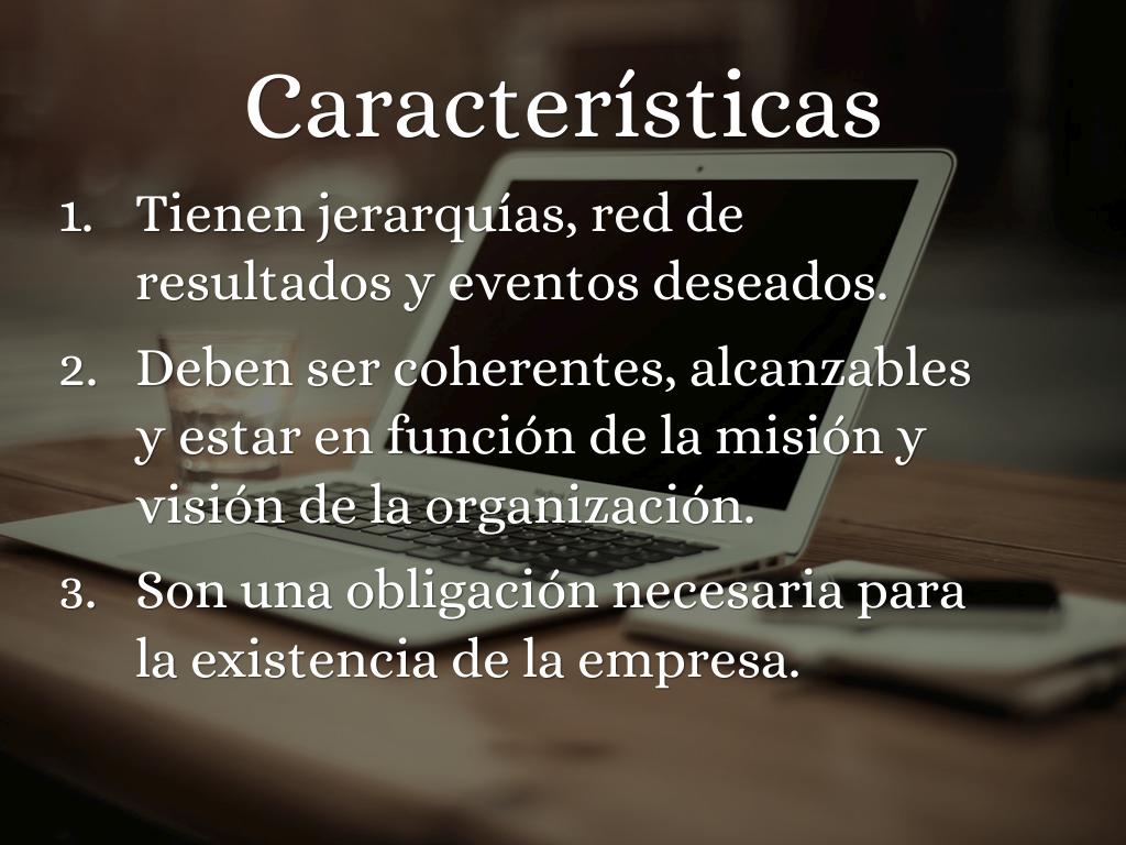 - Deben ser coherentes, alcanzables y estar en función de la misión y visión de la organización.