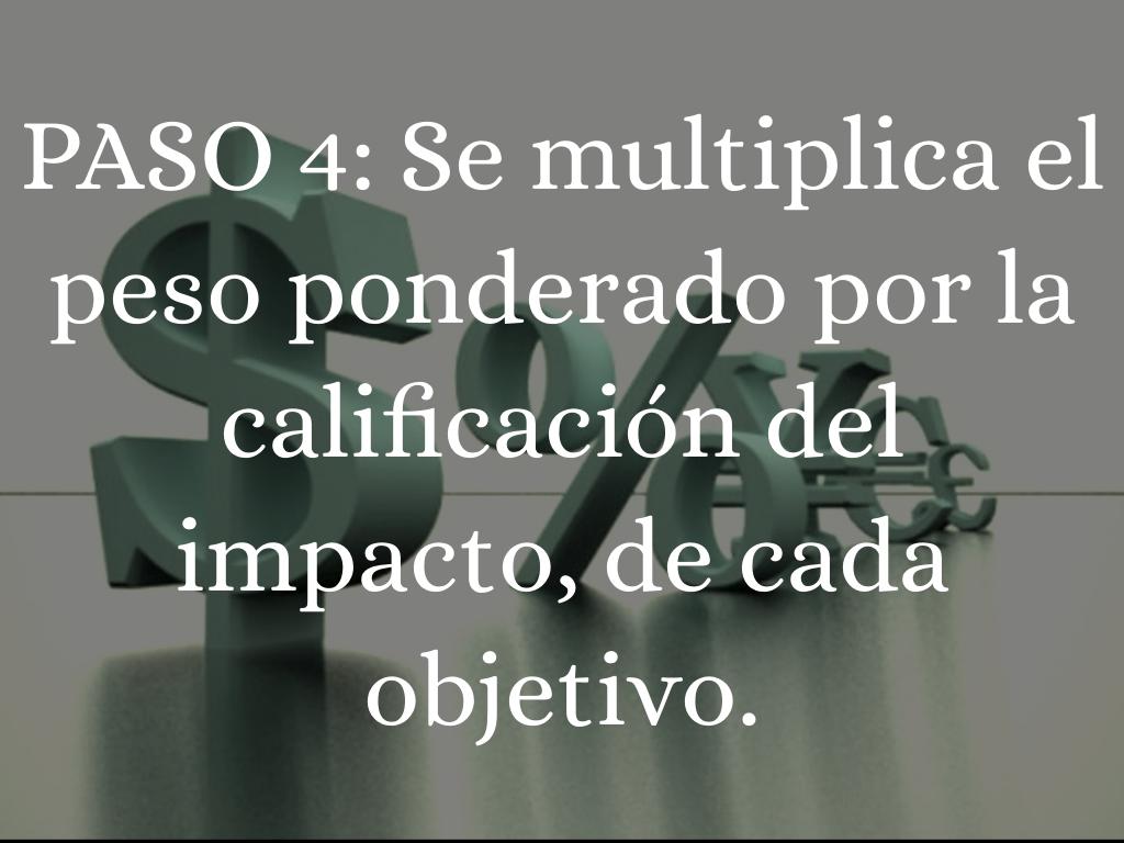 PASO 4: Se multiplica el peso ponderado por la calificación del impacto, de cada objetivo.