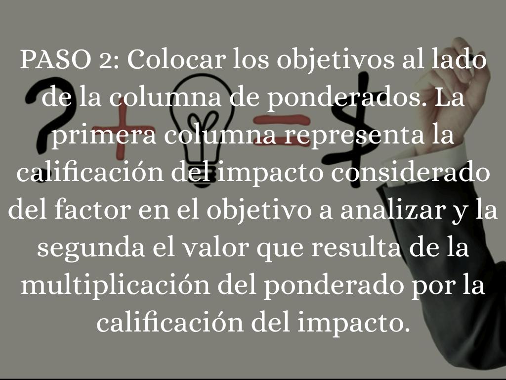PASO 2: Colocar los objetivos al lado de la columna de ponderados. La primera columna representa la calificación del impacto considerado del factor en el objetivo a analizar y la segunda el valor que resulta de la multiplicación del ponderado por la calificación del impacto.