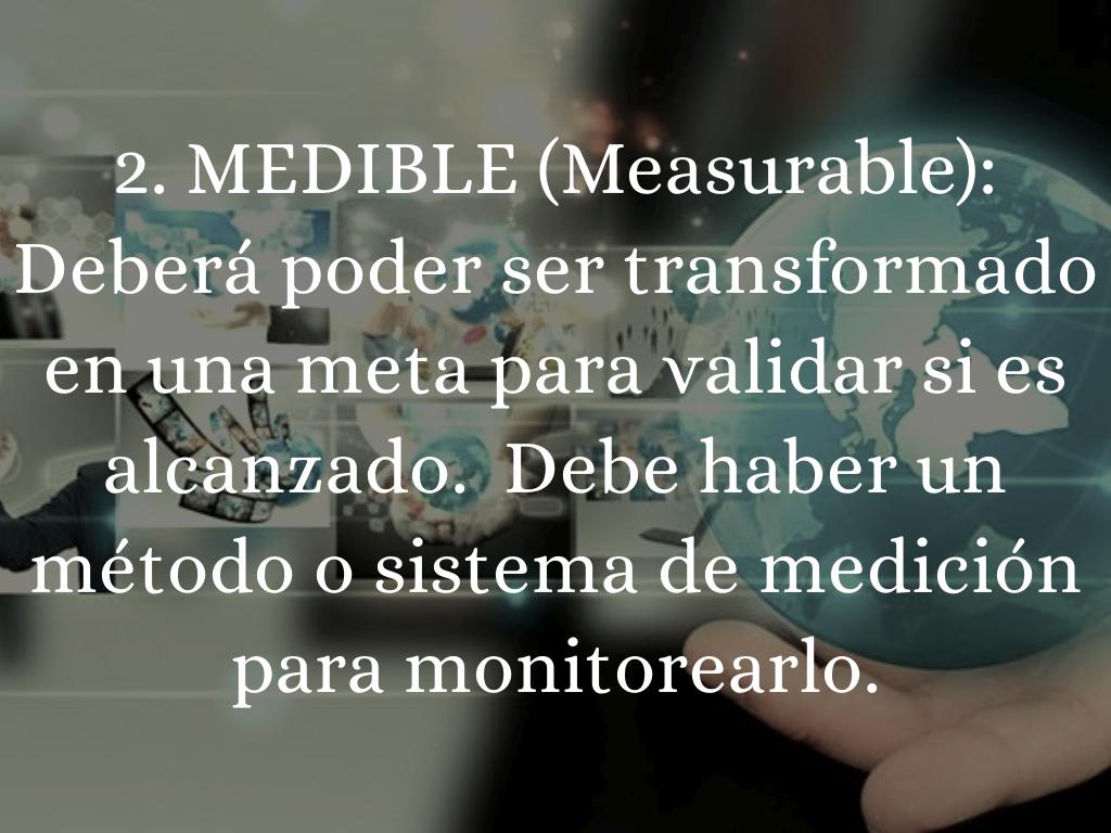 2. MEDIBLE (Measurable): Deberá poder ser transformado en una meta para validar si es alcanzado. Debe haber un método o sistema de medición para monitorearlo.