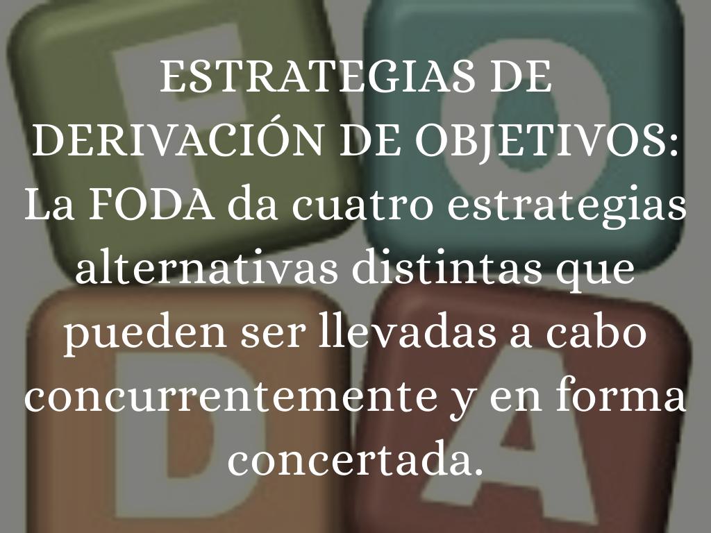 ESTRATEGIAS DE DERIVACIÓN DE OBJETIVOS: La FODA da cuatro estrategias alternativas distintas que pueden ser llevadas a cabo concurrentemente y en forma concertada.