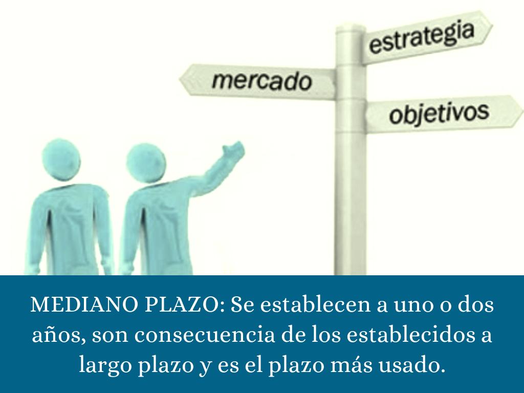 MEDIANO PLAZO: Se establecen a uno o dos años, son consecuencia de los establecidos a largo plazo y es el plazo más usado.