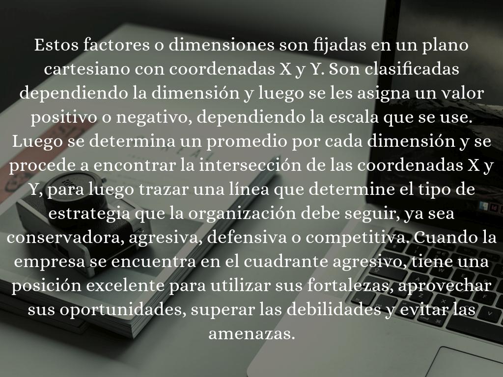 Estos factores o dimensiones son fijadas en un plano cartesiano con coordenadas X y Y. Son clasificadas dependiendo la dimensión y luego se les asigna un valor positivo o negativo, dependiendo la escala que se use. Luego se determina un promedio por cada dimensión y se procede a encontrar la intersección de las coordenadas X y Y, para luego trazar una línea que determine el tipo de estrategia que la organización debe seguir, ya sea conservadora, agresiva, defensiva o competitiva. Cuando la empresa se encuentra en el cuadrante agresivo, tiene una posición excelente para utilizar sus fortalezas, aprovechar sus oportunidades, superar las debilidades y evitar las amenazas.