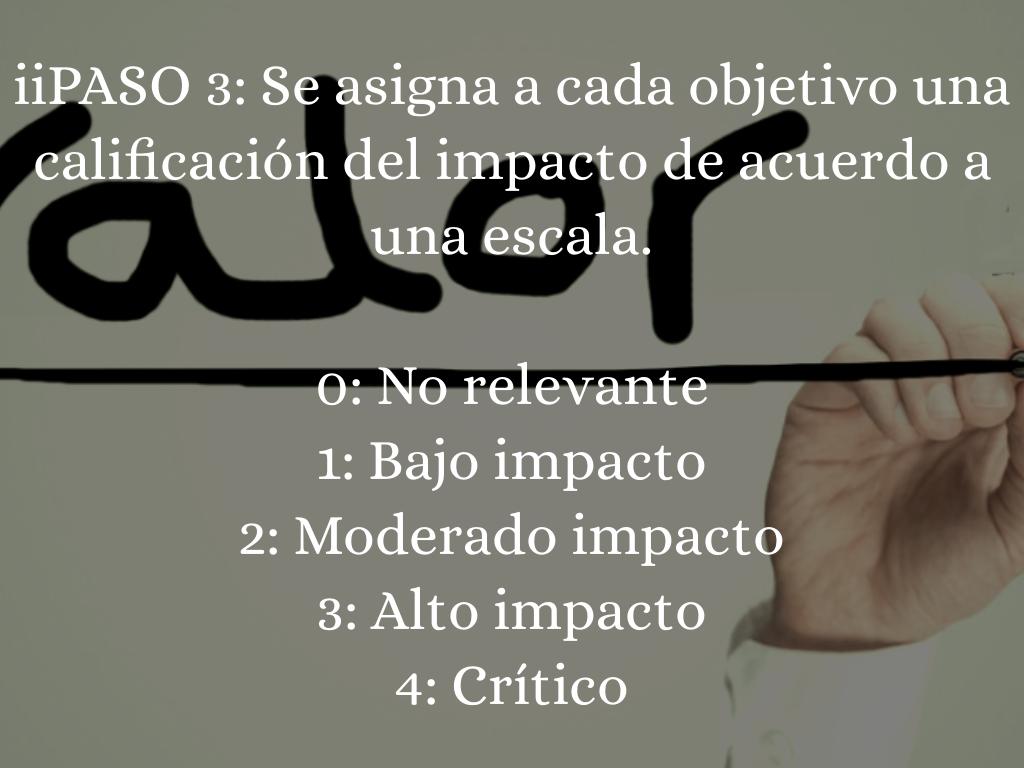 iiPASO 3: Se asigna a cada objetivo una calificación del impacto de acuerdo a una escala.