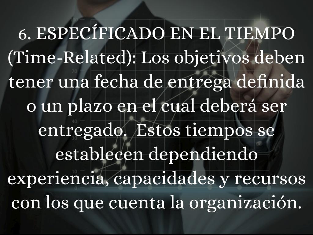 6. ESPECÍFICADO EN EL TIEMPO (Time-Related): Los objetivos deben tener una fecha de entrega definida o un plazo en el cual deberá ser entregado. Estos tiempos se establecen dependiendo experiencia, capacidades y recursos con los que cuenta la organización.