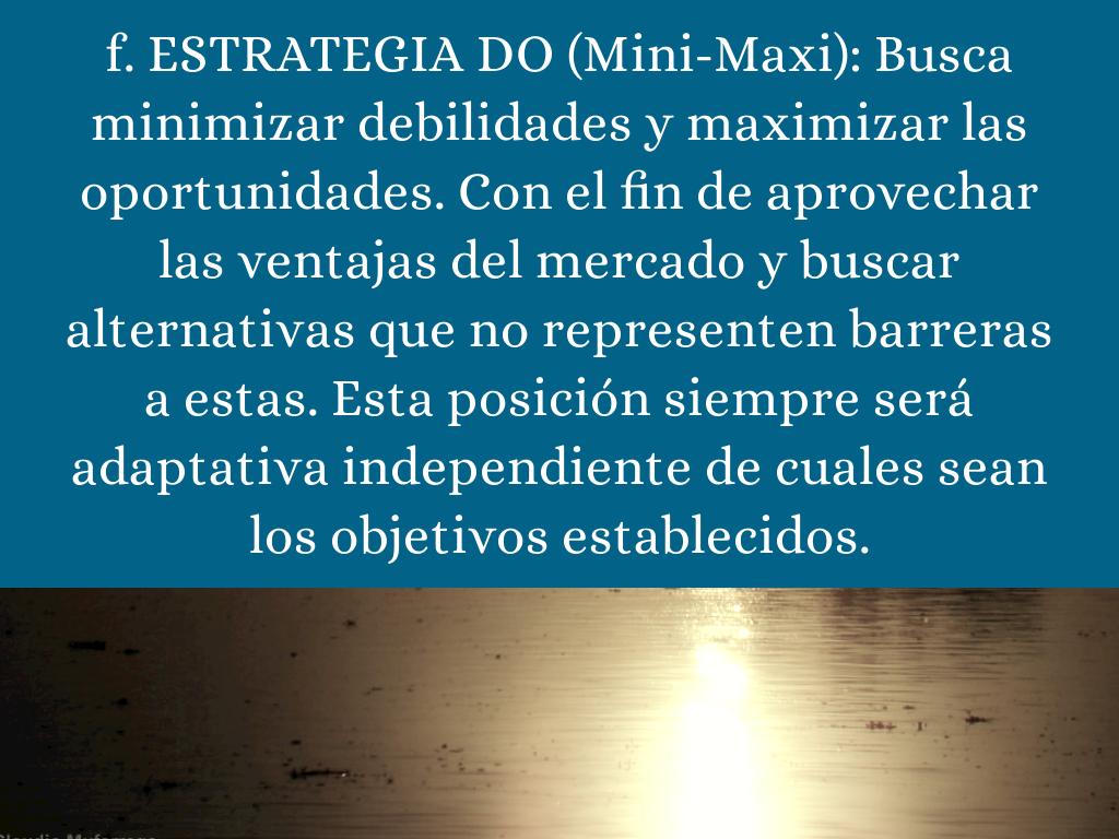 f. ESTRATEGIA DO (Mini-Maxi): Busca minimizar debilidades y maximizar las oportunidades. Con el fin de aprovechar las ventajas del mercado y buscar alternativas que no representen barreras a estas. Esta posición siempre será adaptativa independiente de cuales sean los objetivos establecidos.