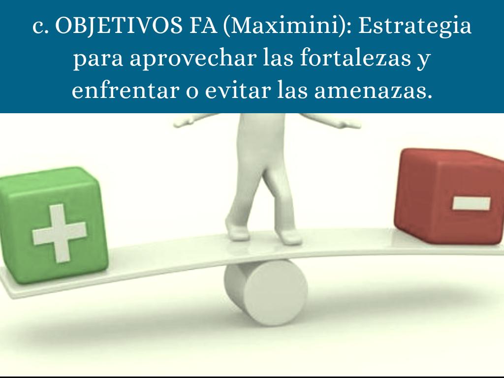 c. OBJETIVOS FA (Maximini): Estrategia para aprovechar las fortalezas y enfrentar o evitar las amenazas.