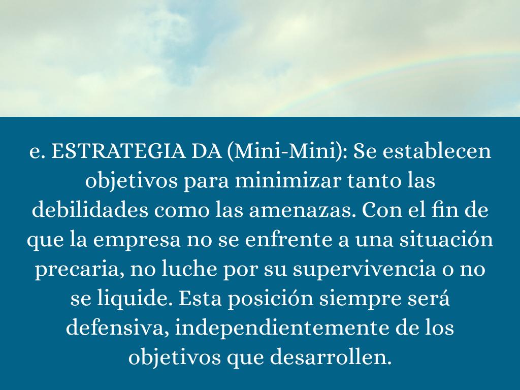 e. ESTRATEGIA DA (Mini-Mini): Se establecen objetivos para minimizar tanto las debilidades como las amenazas. Con el fin de que la empresa no se enfrente a una situación precaria, no luche por su supervivencia o no se liquide. Esta posición siempre será defensiva, independientemente de los objetivos que desarrollen.