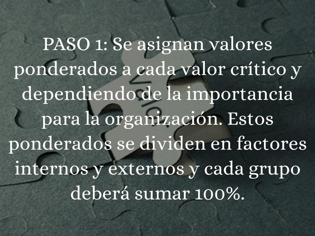PASO 1: Se asignan valores ponderados a cada valor crítico y dependiendo de la importancia para la organización. Estos ponderados se dividen en factores internos y externos y cada grupo deberá sumar 100%.