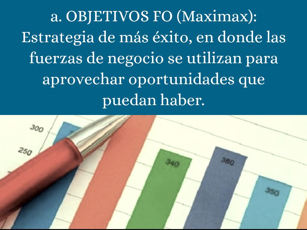 a. OBJETIVOS FO (Maximax): Estrategia de más éxito, en donde las fuerzas de negocio se utilizan para aprovechar oportunidades que puedan haber.