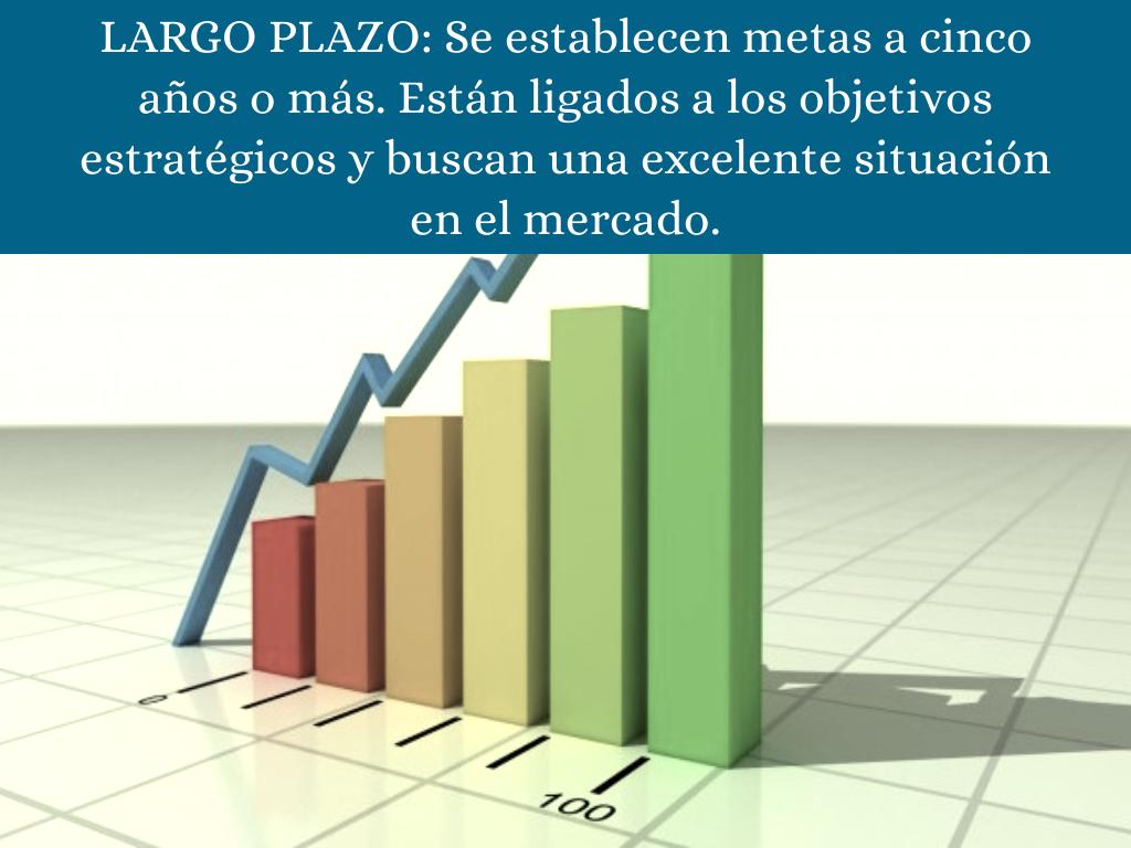 LARGO PLAZO: Se establecen metas a cinco años o más. Están ligados a los objetivos estratégicos y buscan una excelente situación en el mercado.
