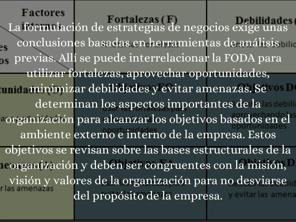 La formulación de estrategias de negocios exige unas conclusiones basadas en herramientas de análisis previas. Allí se puede interrelacionar la FODA para utilizar fortalezas, aprovechar oportunidades, minimizar debilidades y evitar amenazas. Se determinan los aspectos importantes de la organización para alcanzar los objetivos basados en el ambiente externo e interno de la empresa. Estos objetivos se revisan sobre las bases estructurales de la organización y deben ser congruentes con la misión, visión y valores de la organización para no desviarse del propósito de la empresa.